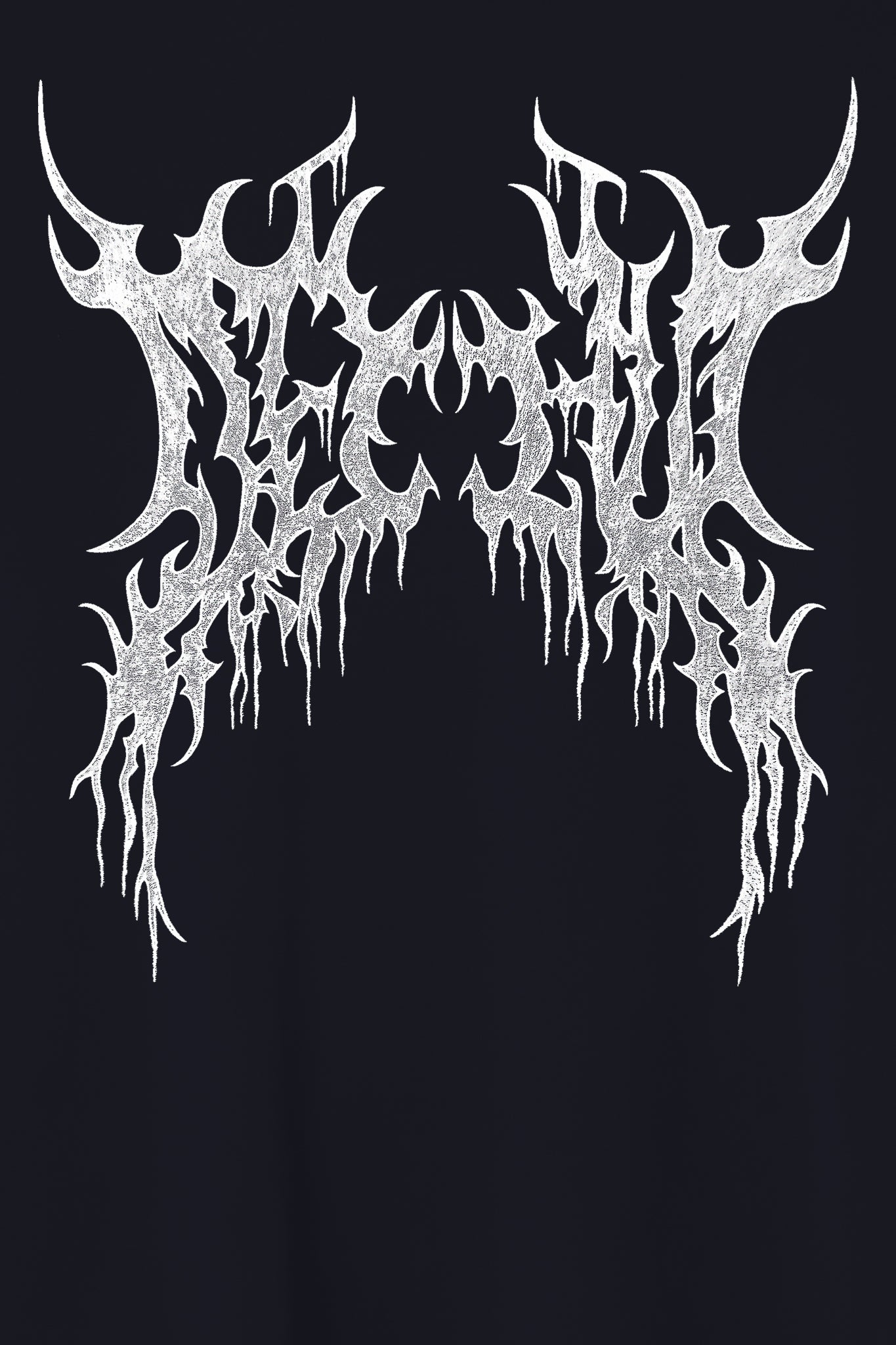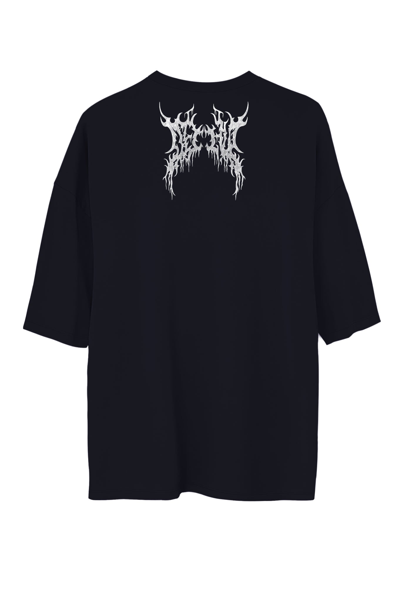 Unisex oversized black cotton T-shirt featuring a hand-drawn metal lettering design by Kim-Lan (Déchue). Regular, relaxed fit with short sleeves and a round neckline. Gray-white print, pencil style of the design in large on the front, and a smaller version under the back collar. High-definition direct print for maximum detail (very long-lasting).
