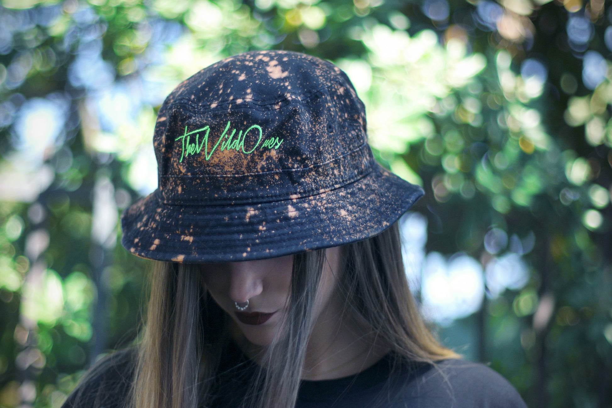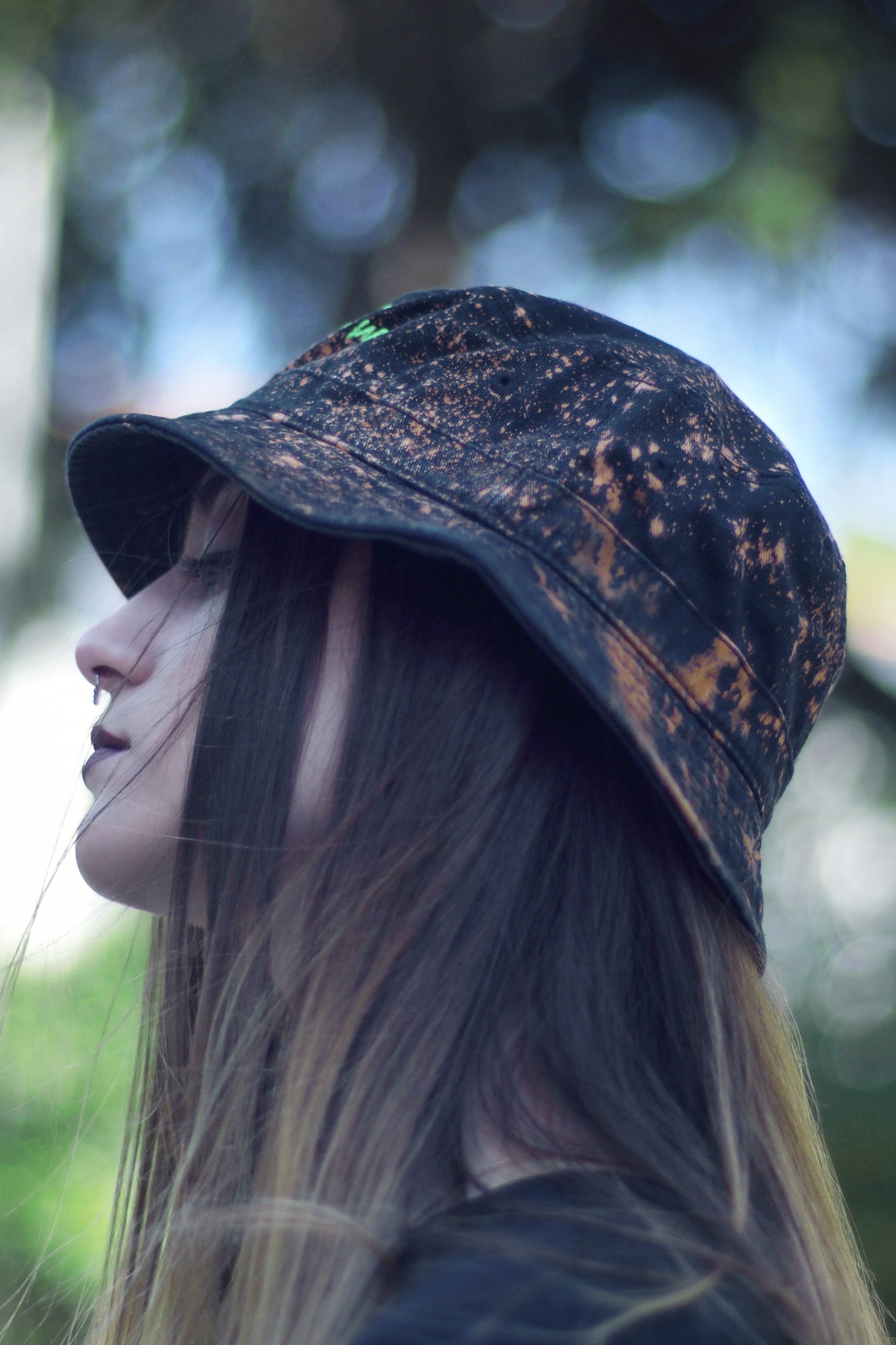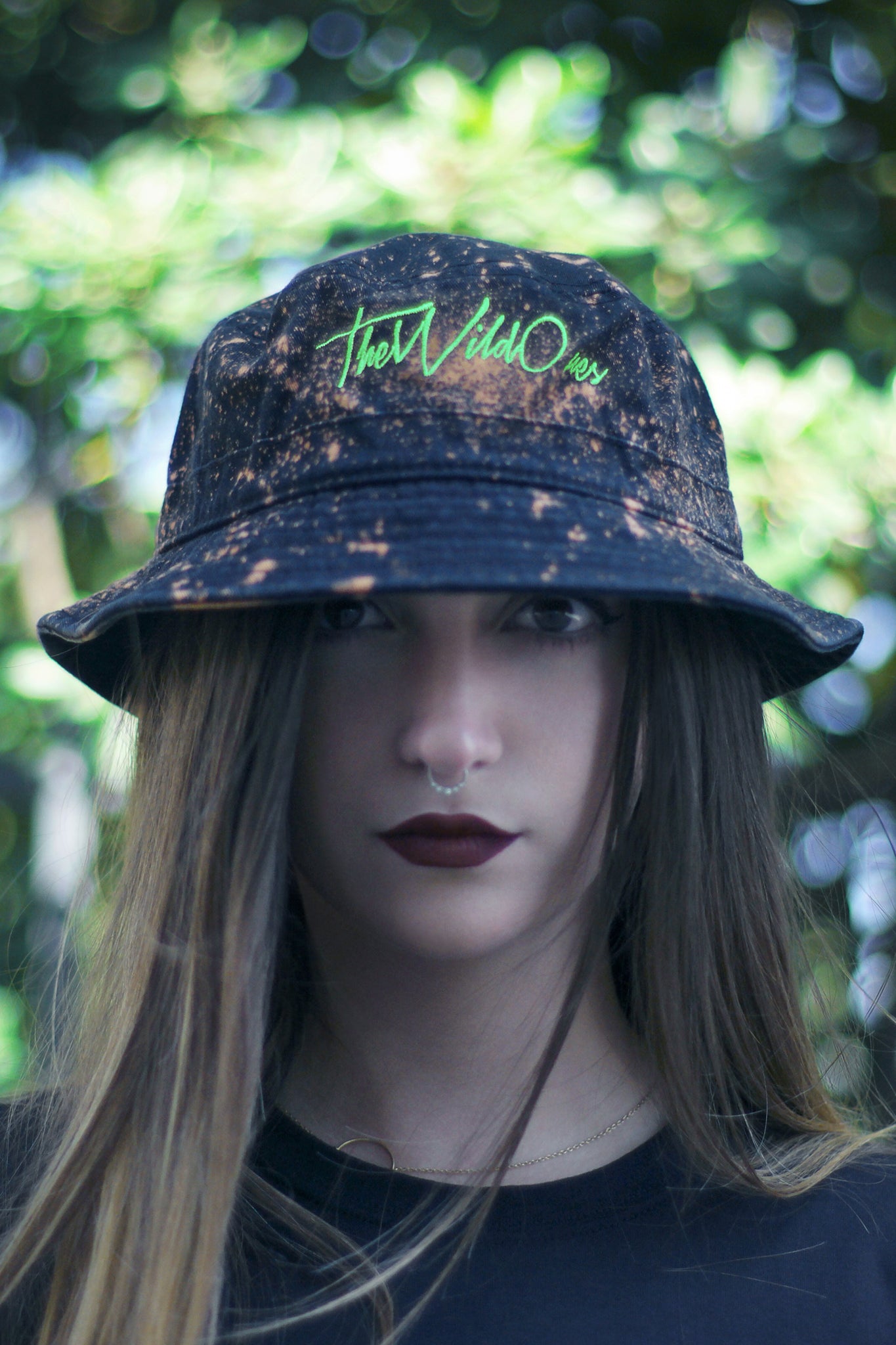 Bob noir 100% coton avec 4 œillet d'aération. Pièce unique décolorée. Signature verte extraterrestre brodée sur le devant.